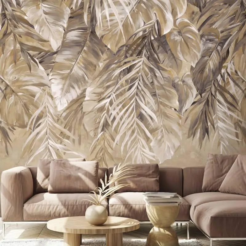 Design GLAMORAMA zeigt ein großes Motiv mit Blättern im Botanical-Stil auf einem Hintergrund in zurückhaltender Textiloptik. Die Digitaldruck-Tapete setzt sich aus 8 Bahnen zusammen und ergibt ein wunderschönes Wandbild mit den Maßen 2.70 m Höhe x 4.00 m Breite.