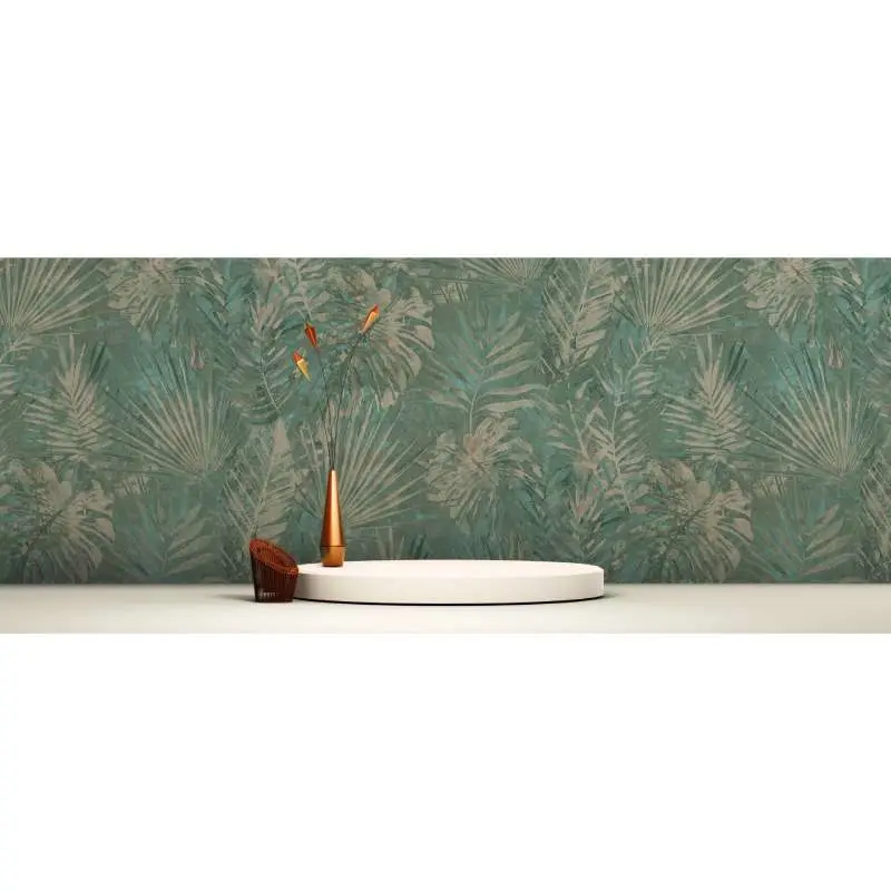 Das Design im trendigen Botanical-Stil zeigt ein Muster mit Blättern von Palmen und Monstera und verwandelt jede Wand im Handumdrehen in einen Hingucker mit tropisch-exotischem Charme.