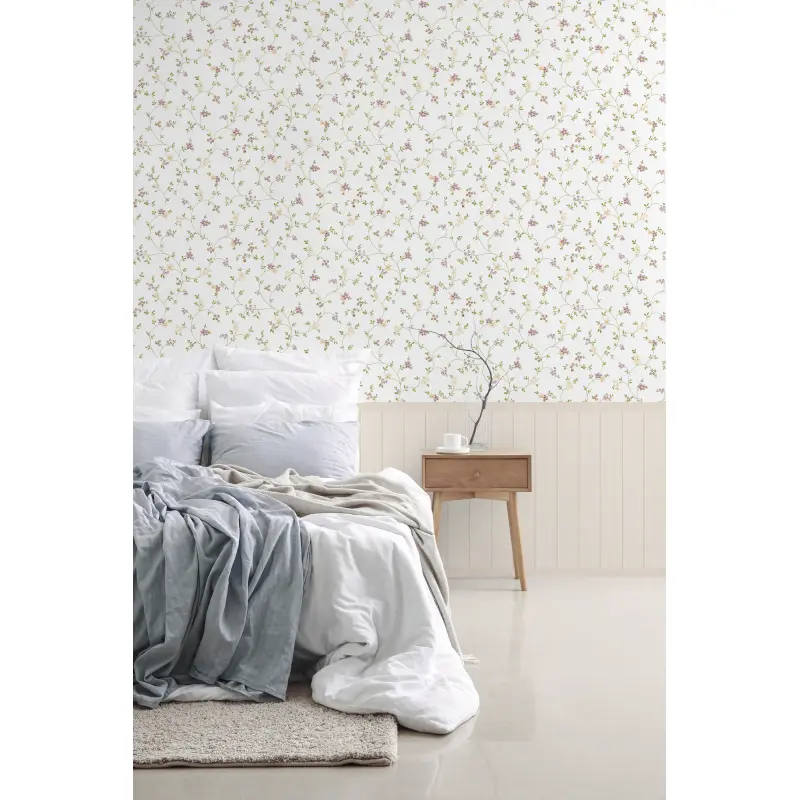 Fototapete Blumenranken mit Holzpaneel Weiß Rosa - Vliestapete Landhausstil (KG-175871)