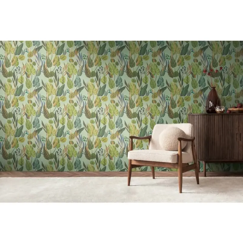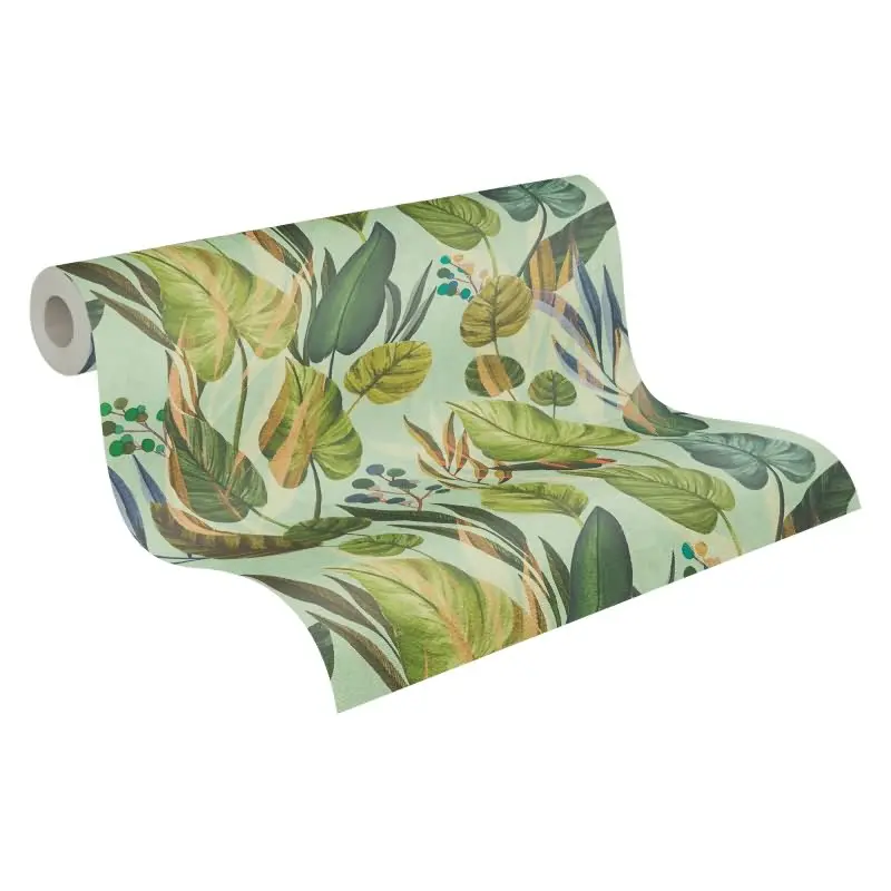 Tropische Tapete mit großflächigem Blattmotiv in Grüntönen auf mintgrünem Grund livingwalls (KG-175226)