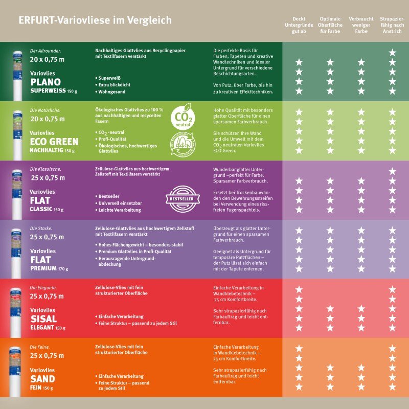 ERFURT-Variovlies Plano Superweiss (20 m x 0,53 m) kann auf allen tapezierfähigen Untergründen im Innenbereich eingesetzt werden. Der Untergrund muss trocken, tragfähig, gleichmäßig saugfähig, sauber, glatt und für die vorgesehene Wandbekleidung hinreichend ebenflächig sein. Bei fachgerechter Verarbeitung ist das Glattvlies leicht entfernbar.