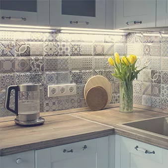 Fliesen Küche: White kitchen with patchwork tile: ©Petrova-Apostolova/stock.adobe.com