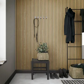 | Flur Tapete Beige Holzlamellen-Optik 1044644 | Die Holzlamellen-Tapete bringt einen natürlichen Touch in den Flur |