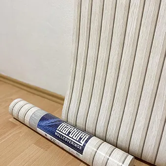 Möchten Sie, dass die Holzleisten von unten nach oben (senkrecht/vertikal) verlaufen, hilft Ihnen eine zuvor an die Wand gezeichnete Lot-Linie, die erste Bahn exakt senkrecht auszurichten. Die nachfolgenden Bahnen kleben Sie mit Ruhe und Sorgfalt auf Stoß. Dadurch erhalten Sie ein sauberes Gesamtbild mit Holzstreifen in gleicher Richtung und mit einheitlichen Abständen zueinander.