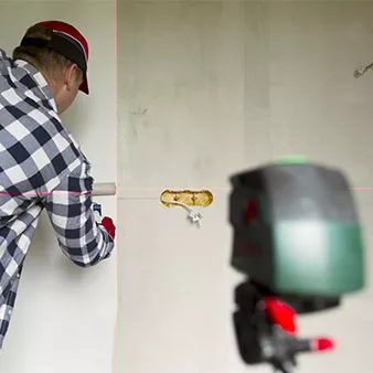 Ausloten mit Laser: Glueing wallpapers at home. Young man, worker is putting up wallpapers on the wall. Home renovation concept:©artursfoto/stock.adobe.com